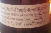 This bottle was purchased at a local store for $79. It is 10 years old. Pulled from barrel #2070, it is 63.1% ABV (126.2 proof). It is marked as bottle 118 of 161